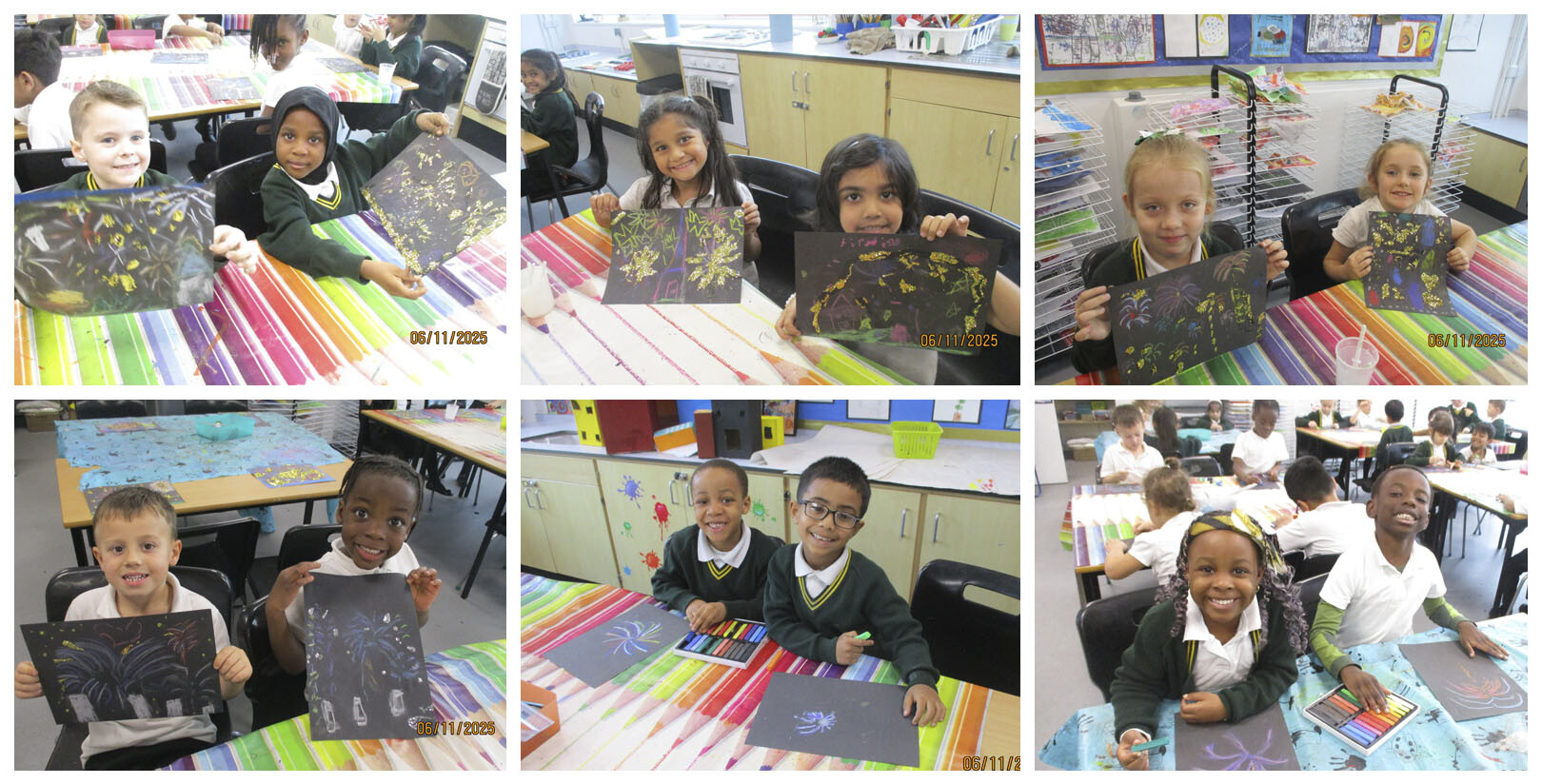 Inspired by the colourful displays, the class created their own firework artwork using oil pastels and glitter. The children experimented with bold lines, bright colours and sparkling effects to represent fireworks lighting up the night sky. The finished pieces are full of energy and imagination, and the children were very PROUD to share their work. It has been a fun and creative way to learn about this special event!