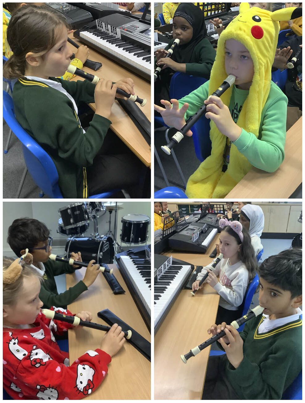 Year 4 are PROUD to be learning how to play the recorder. They can now play a variety of notes to a number of tunes and know how to read music scores.  They are extremely talented and enjoy their weekly music lessons.  Well done to them all!