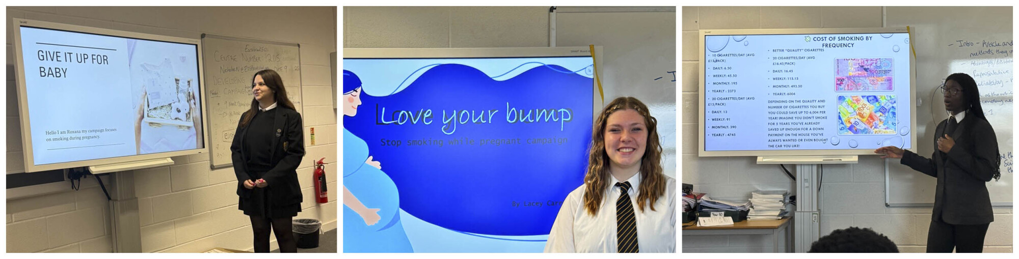 As part of their course, Year 11 students were tasked with planning and preparing a stop-smoking health campaign. They spent time researching and planning key areas such as aims, timescales, and safety considerations. Once completed, they presented their campaigns to the relevant audience. The Year 11 students worked very hard to make their campaigns engaging, using quizzes, raps, and leaflets to communicate their messages.