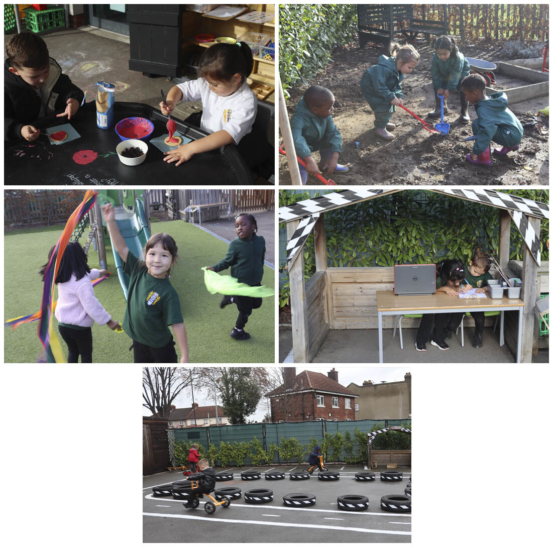 This week our youngest learners have enjoyed an exciting range of activities that support both their learning and wellbeing in their newly developed outdoor area. Children have been busy using the road to ride their vehicles with purpose, exploring the effects of a pestle and mortar on potatoes in the mud kitchen, seeking out mark making opportunities in Eastbrook's mini Halfords, digging and clearing some mud to support Mr Thorn in the construction area, creating poppy biscuits to mark Remembrance Day and practising their Diwali dance moves using ribbons and scarves, amongst many other things. Matas said, “I love learning outside with my friends.” All of the Reception team will continue working tirelessly to create the most amazing space possible for our EYFS pupils. It has been wonderful to see our Reception learners so engaged, enthusiastic, and eager to discover new possibilities in their outdoor environment despite the colder and wetter weather.