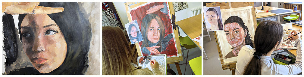 We are PROUD of our Year 12 artists, who are currently in ‘Final Outcome Production' mode for their portrait unit of work. Students have taken a series of self-portraits, selected their most successful photograph and are now working on a final painting, having scaled up their image. Interested in knowing more about our Visual Arts department and our A Level provision? Feel free to get in touch to discuss our course and even arrange a visit!
