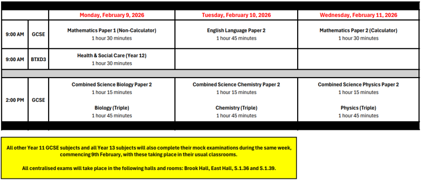 Please refer to the table and information below regarding the Year 11 and 13 mock 2 exam arrangements for February 2026:
