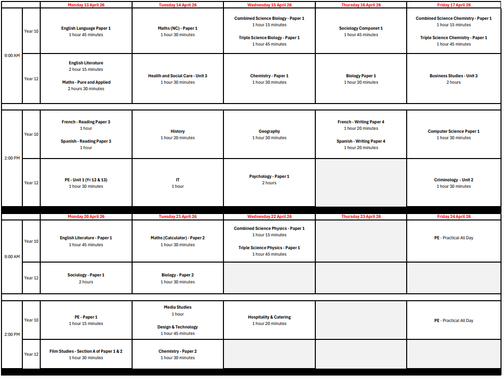Please refer to the table and information below regarding the Year 10 and 12 mock exam arrangements for April 2026.